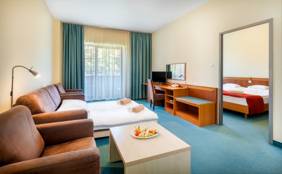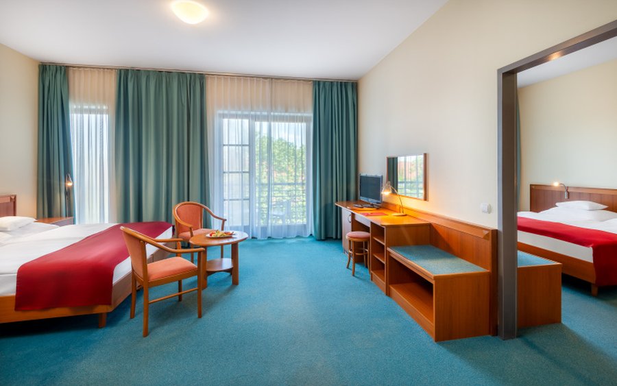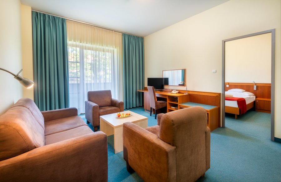 Hotel se nachází v centru městské rekreační zóny, v sousedství nejdynamičtěji se rozvíjejících léčebných a plážových lázní Maďarska, se kterým je propojen vyhřívaným koridorem, který se nachází v 1. patře hotelu.