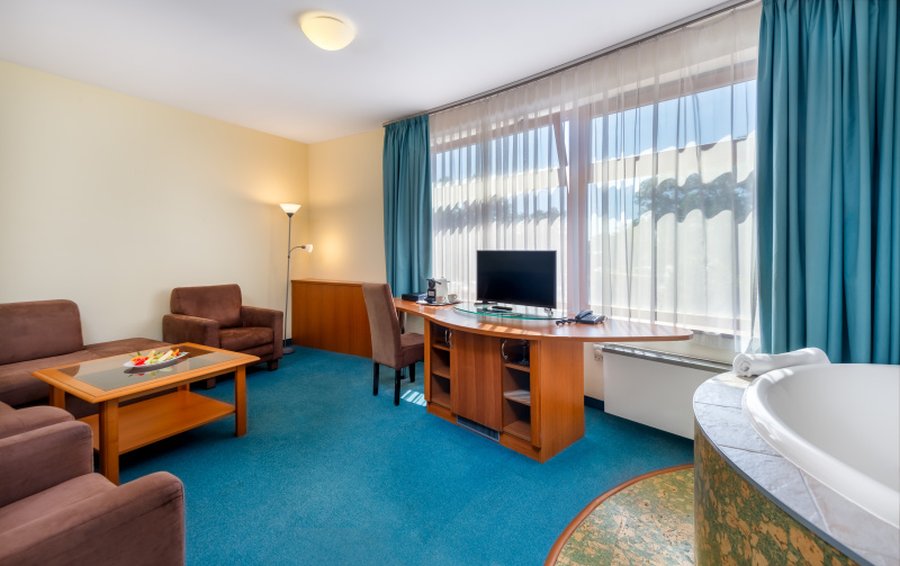Jedná se o zcela nový 4* hotel a jako jediný je propojen s lázeňským areálem, aquapark s atrakcemi, vnitřní aqupark AQUAPALACE s atrakcemi pro děti, skluzavkami, tobogány.