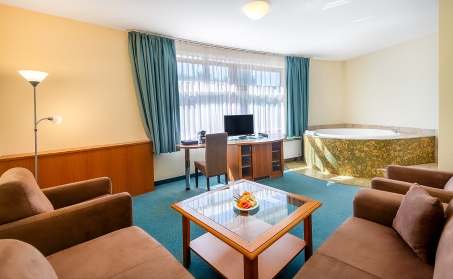 Vybavení a služby: klimatizovaná restaurace, bar, konferenční místnost, 2 výtahy, volný přístup na internet, lékárna, úschovna zavazadel, parkoviště, garáže, wellness centrum - jacuzzi, bazén (9 m), sauny, zážitkové sprchy. Lázeňské centrum: solárium, fitness, tělocvična, Dermalife spa & wellness terapie. Od května do září (dle provozní doby) venkovní bazény, jacuzzi, bazén s vlnobitím, zážitkový bazén, tobogány, dětský bazén a unikátní umělé středomořské pláže s bazénem se slanou vodou. AQUAPALACE - vnitřní aquapark s atrakcemi. Termální lázně - vnitřní termální lázně - 3 bazény, každý s různou teplotou, venkovní termální bazény - 2 bazény s termální vodou, 1x menší bazén na plavání, bazén s vodním hřibem a krčními sprchami.